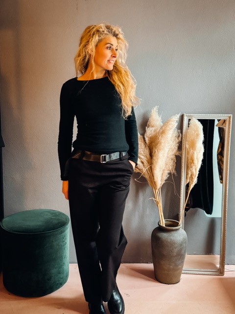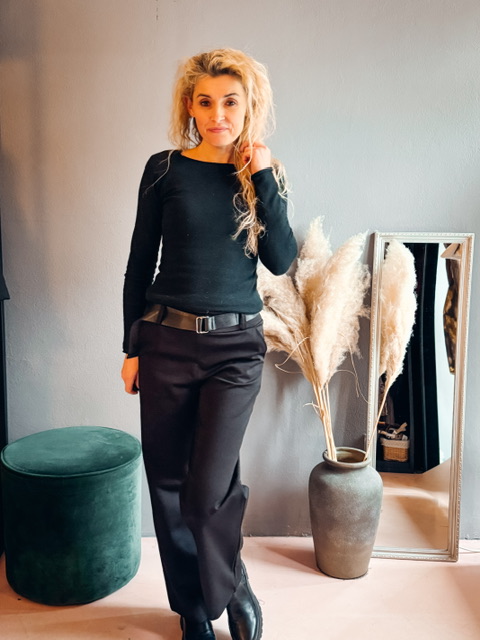 Udobne široke hlače z elastiko v pasu in pasom, po velikosti. Dolžina ustreza za višino do 170cm.