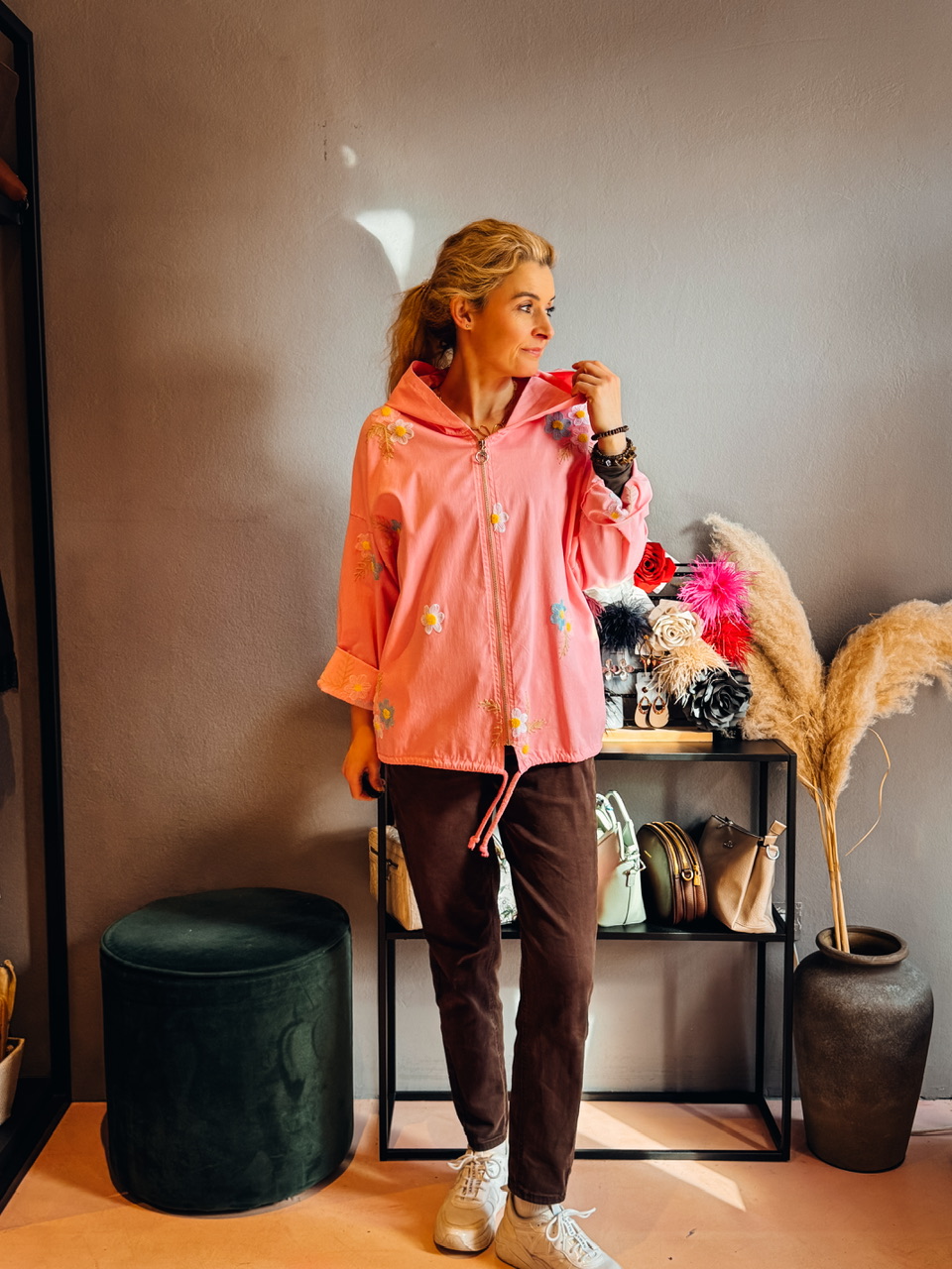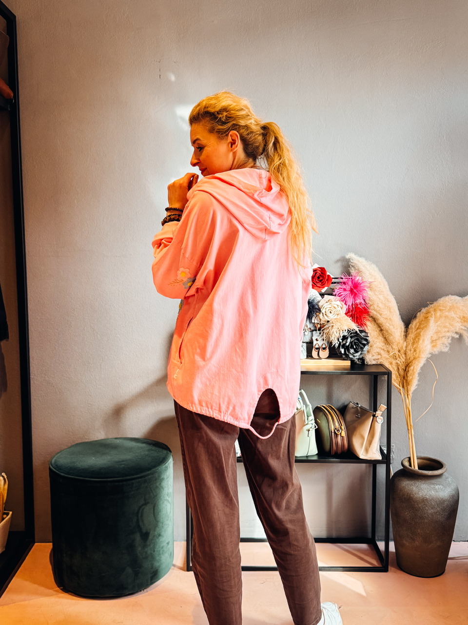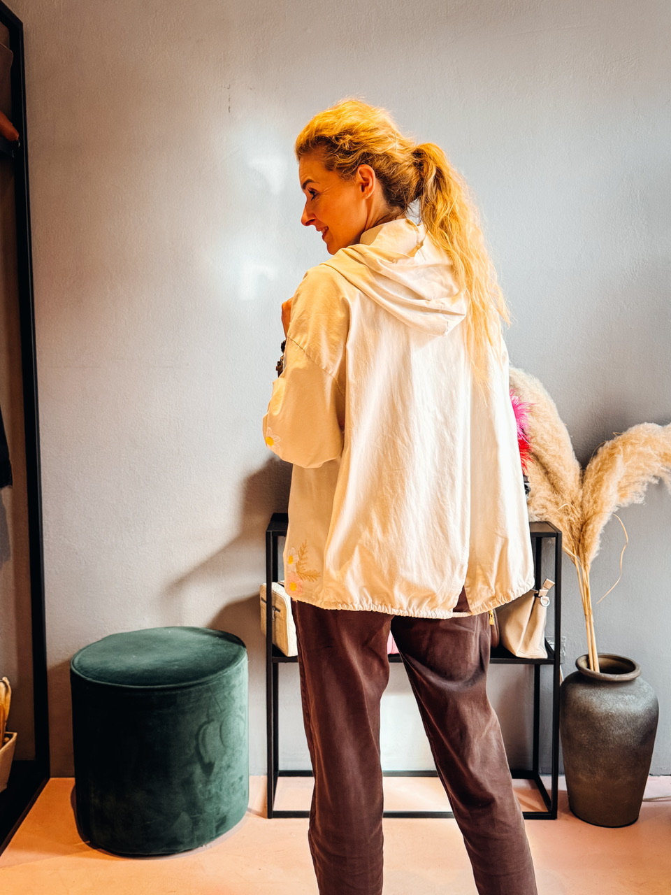 Lahkotna prehodna jakna z žepi in kapuco, lahko se telira v pasu. Zapira se z zadrgo. Obseg prsi je 120cm.