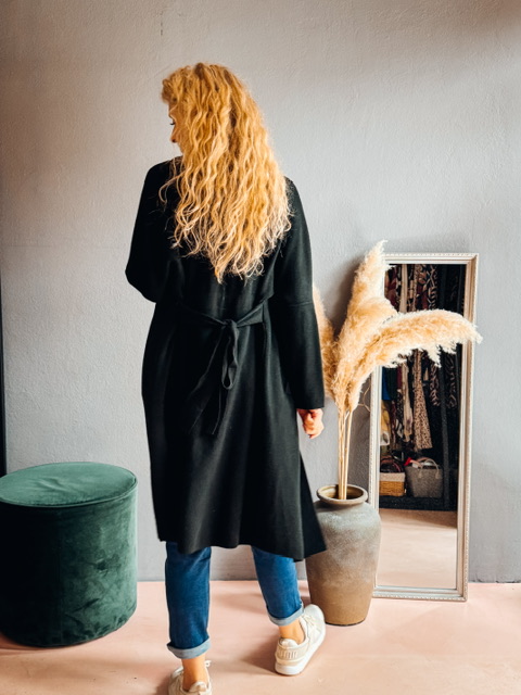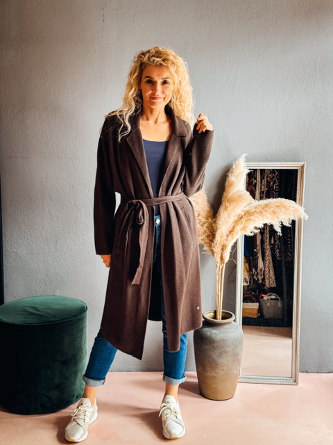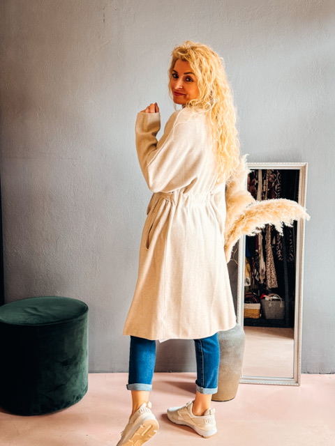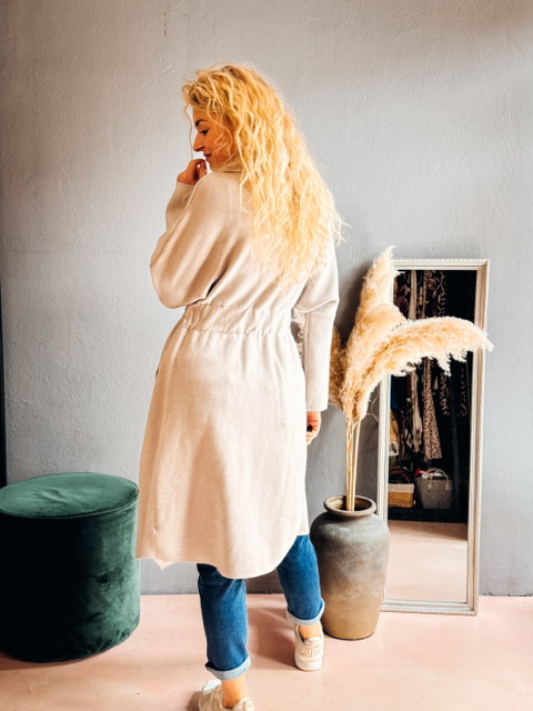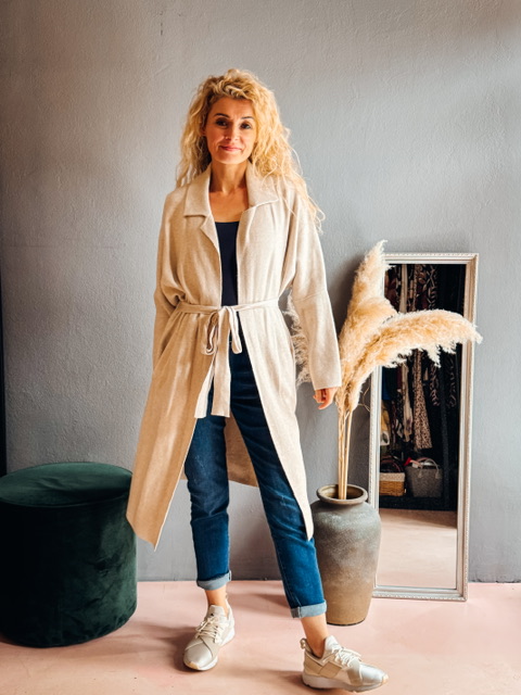 Modna jopica z žepi in trakom, ki se zaveže v pasu.