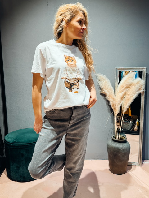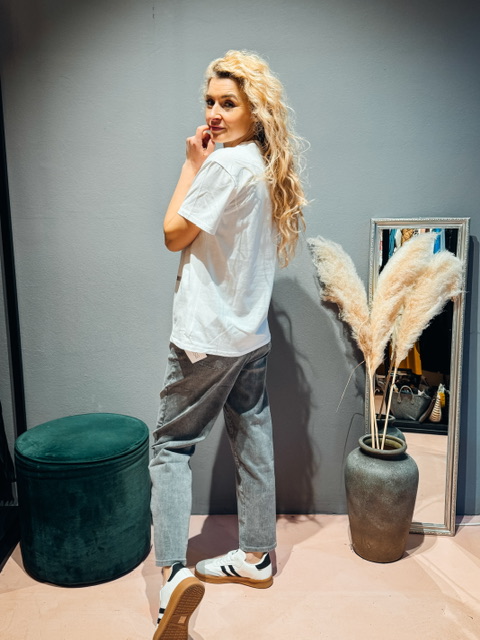 Bombažna majica s potiskom za konfekcijo 38-42. Pri 38 pride širše, pri 42 oprijeta.