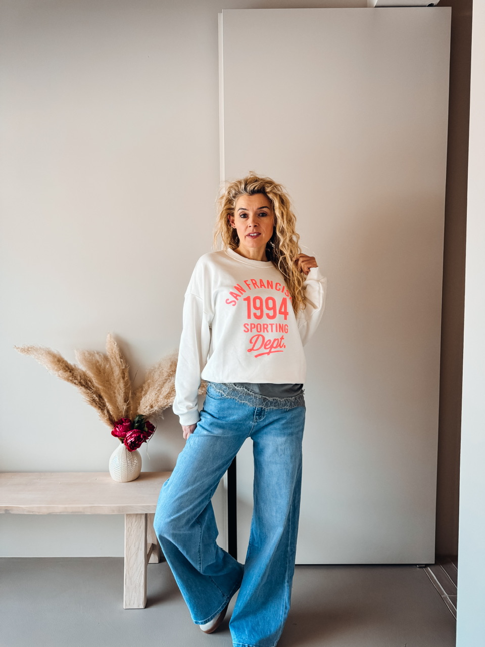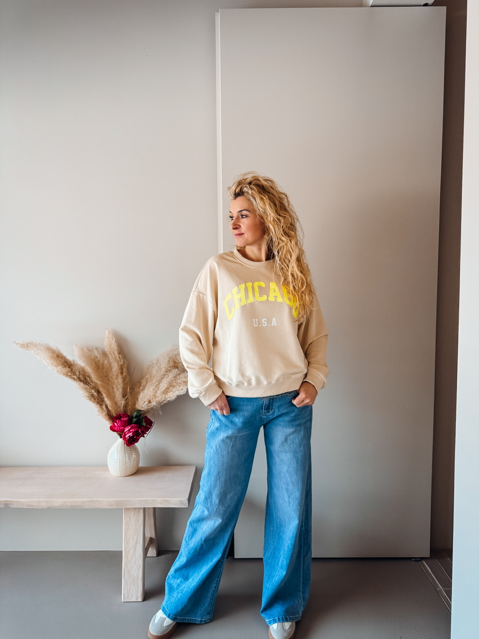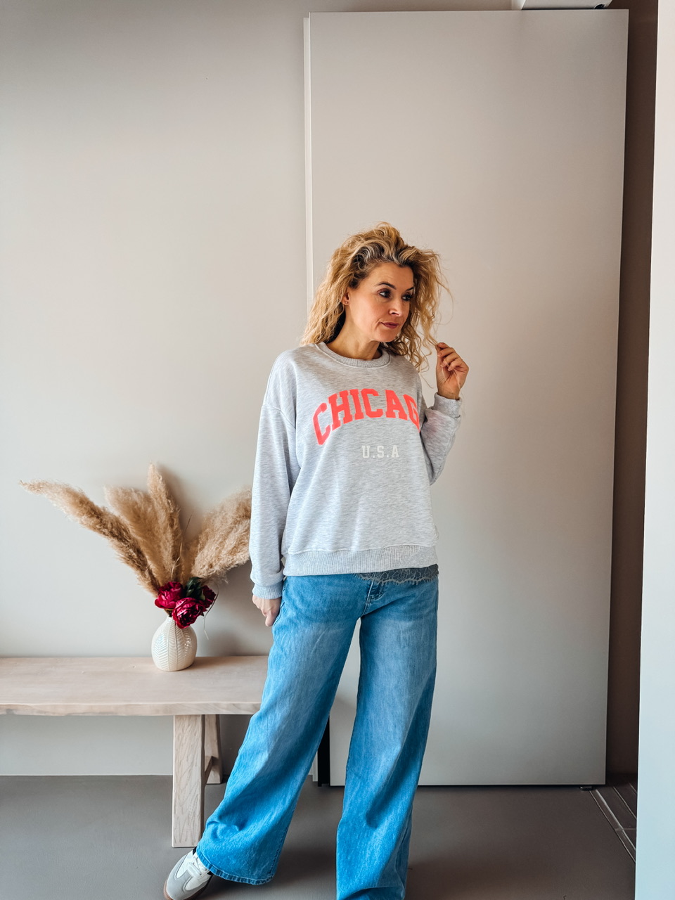 Oversize pulover s potiskom. Teliran pri L, širok za s/m.