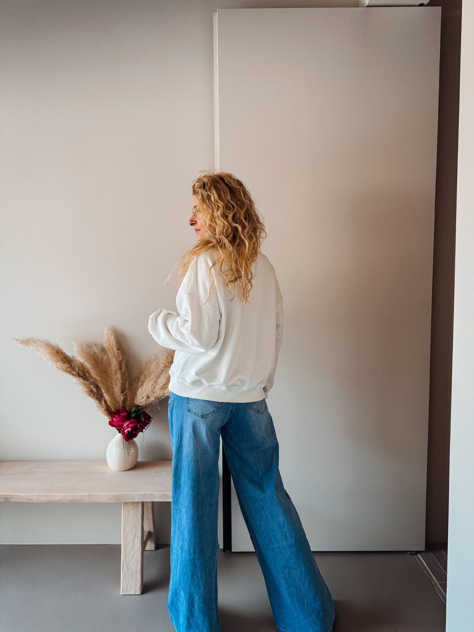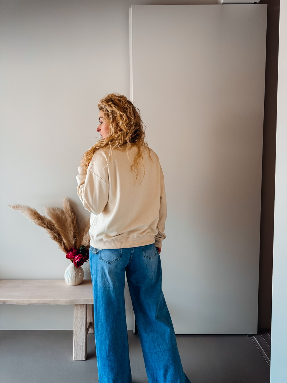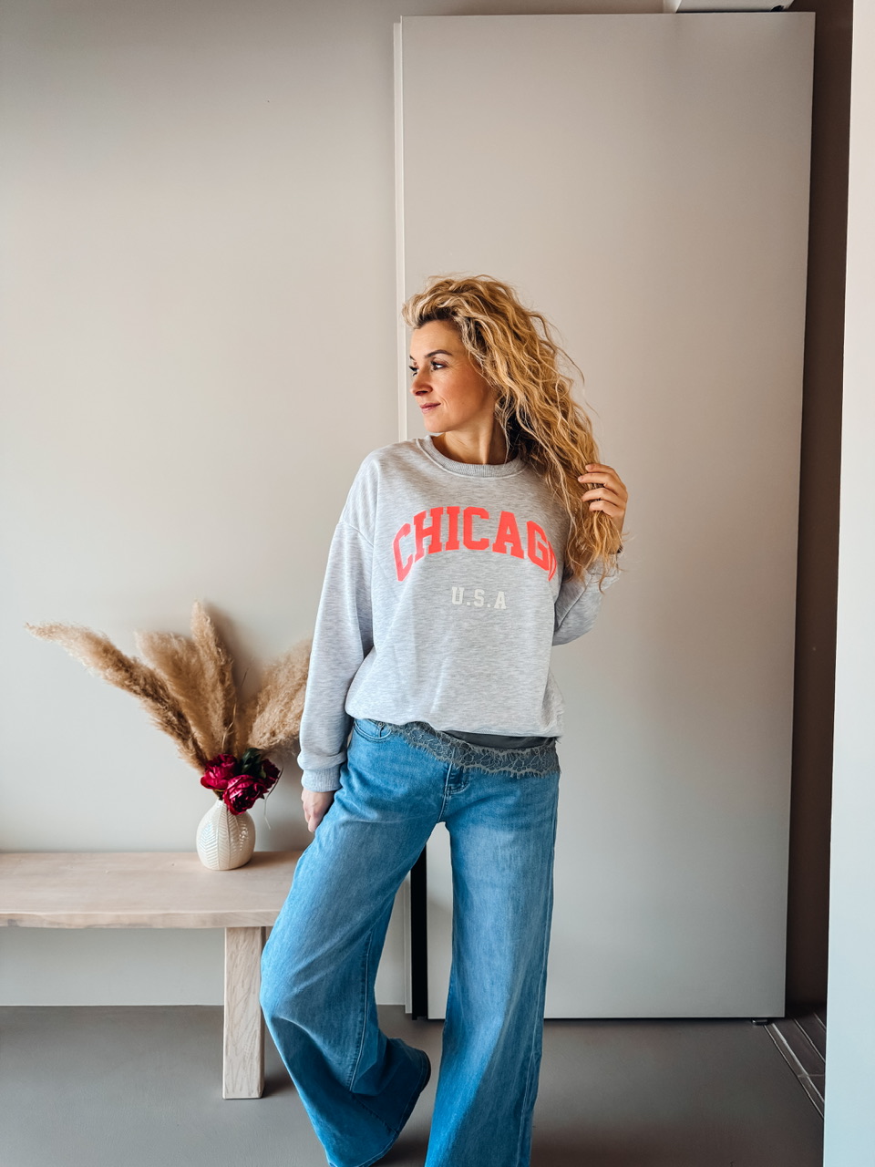 Oversize pulover s potiskom. Teliran pri L, širok za s/m.