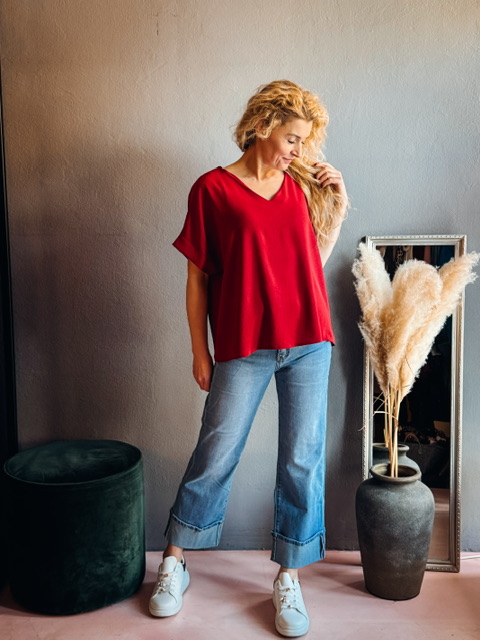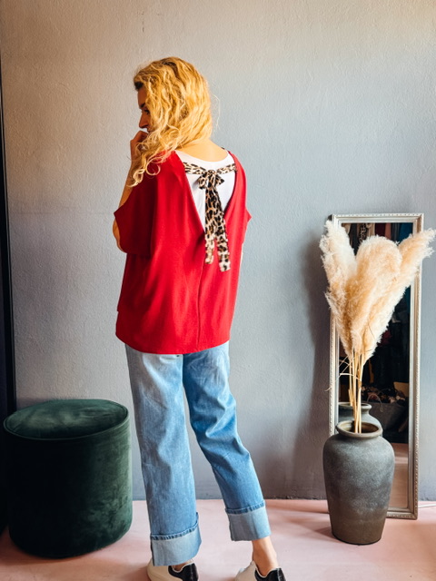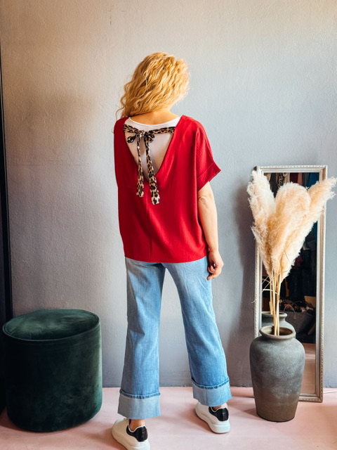 Modna majica s kratkimi rokavi in pentljico na hrbtu. Obseg prsi je 124cm.