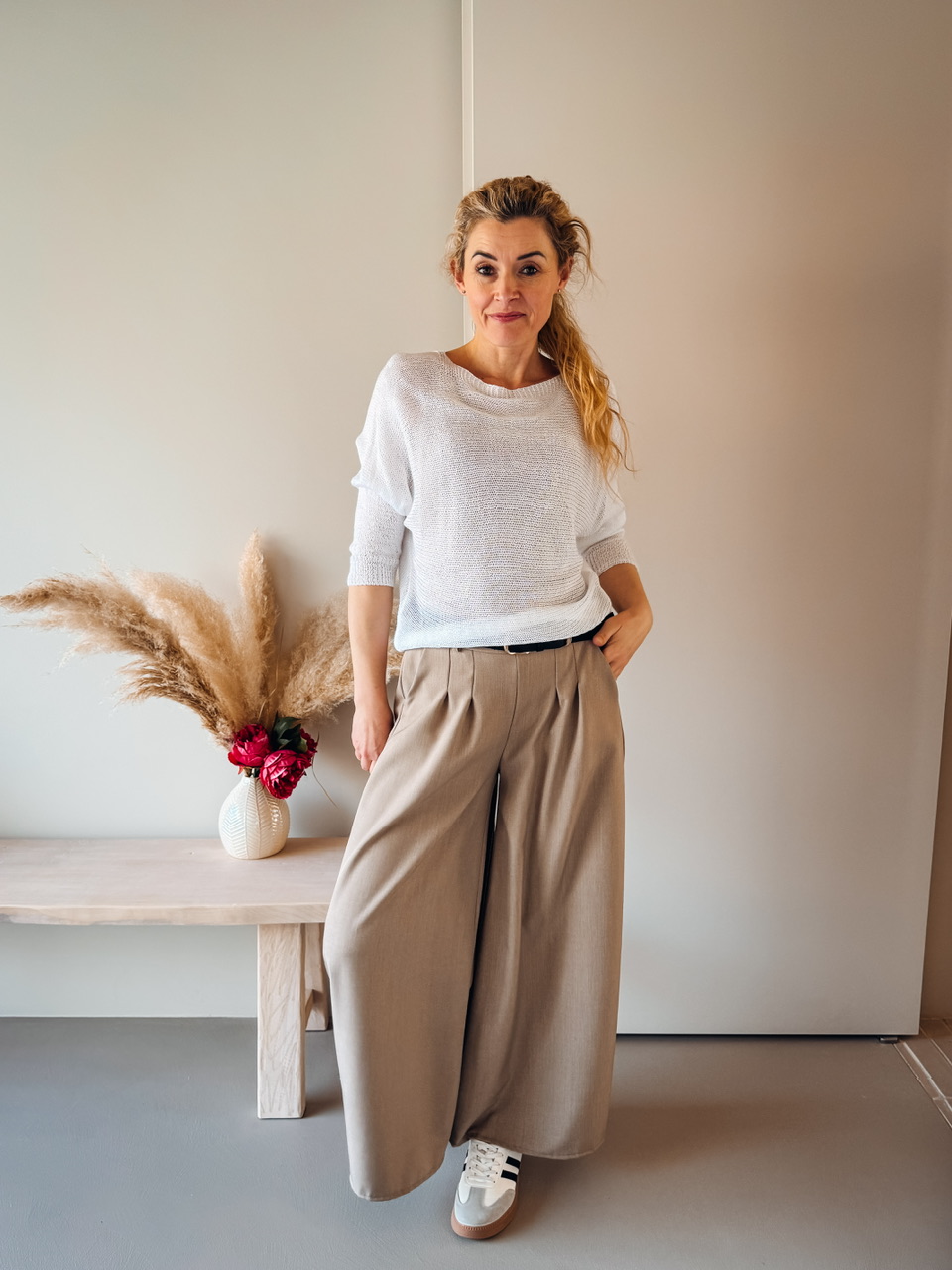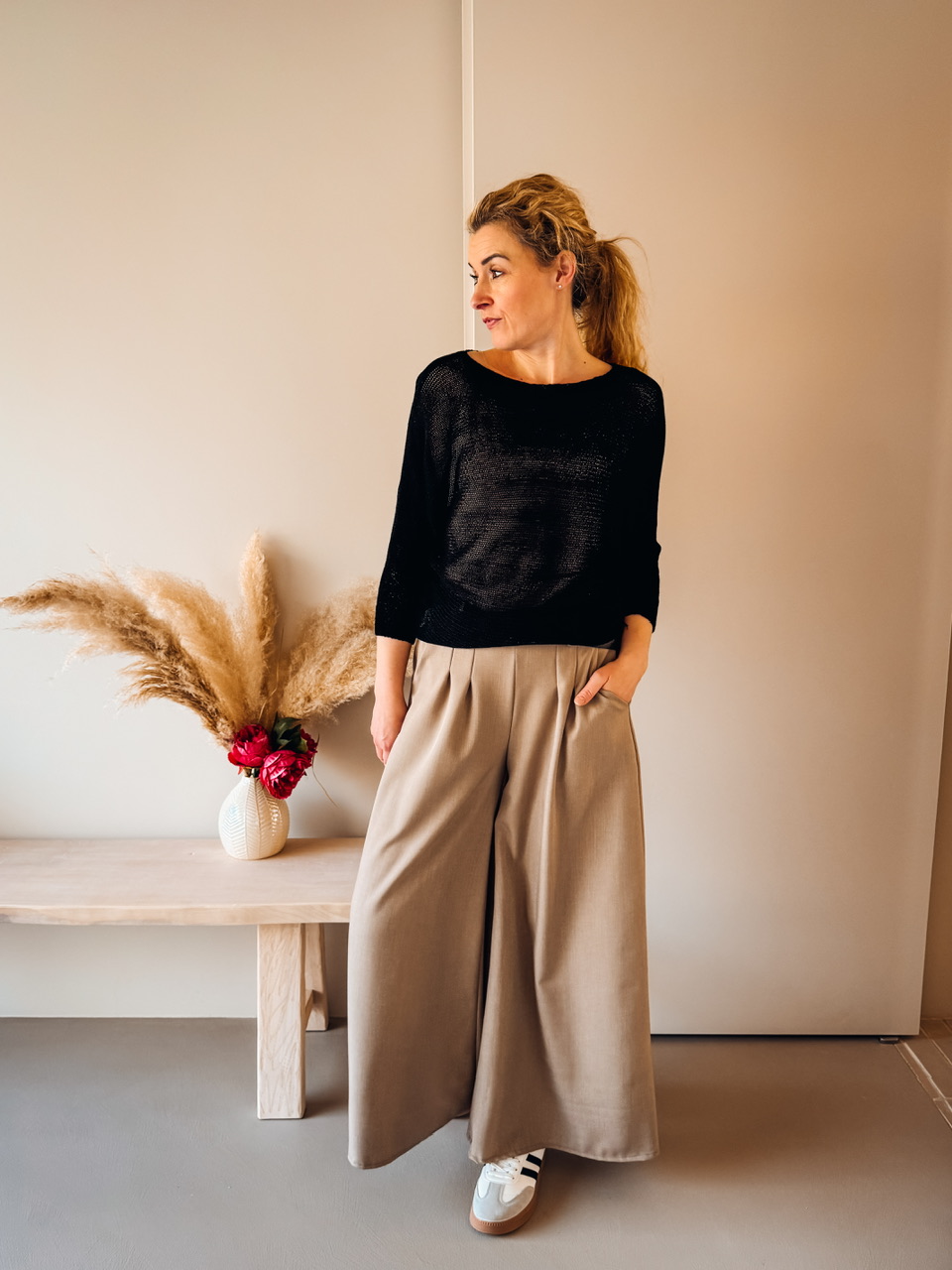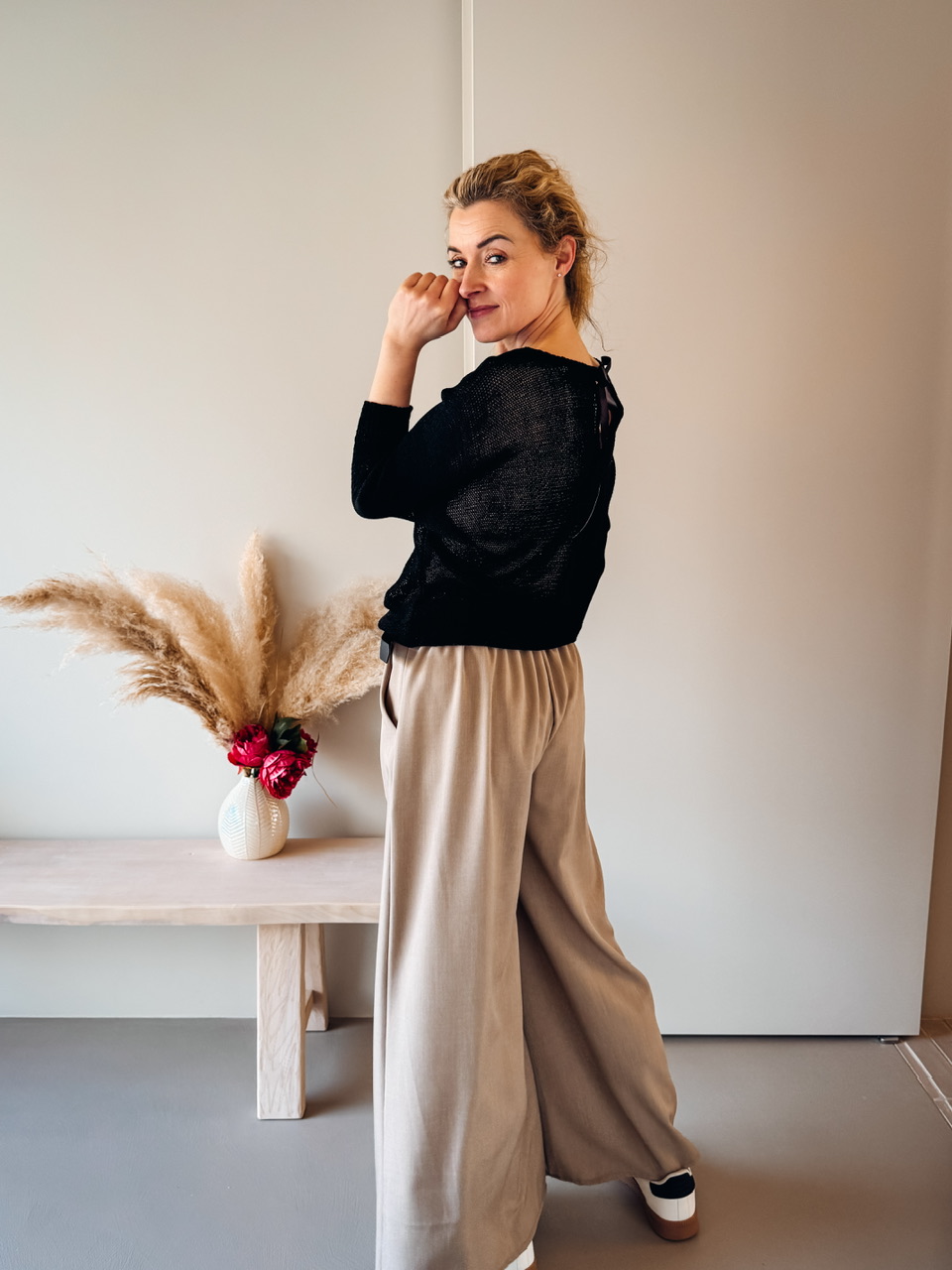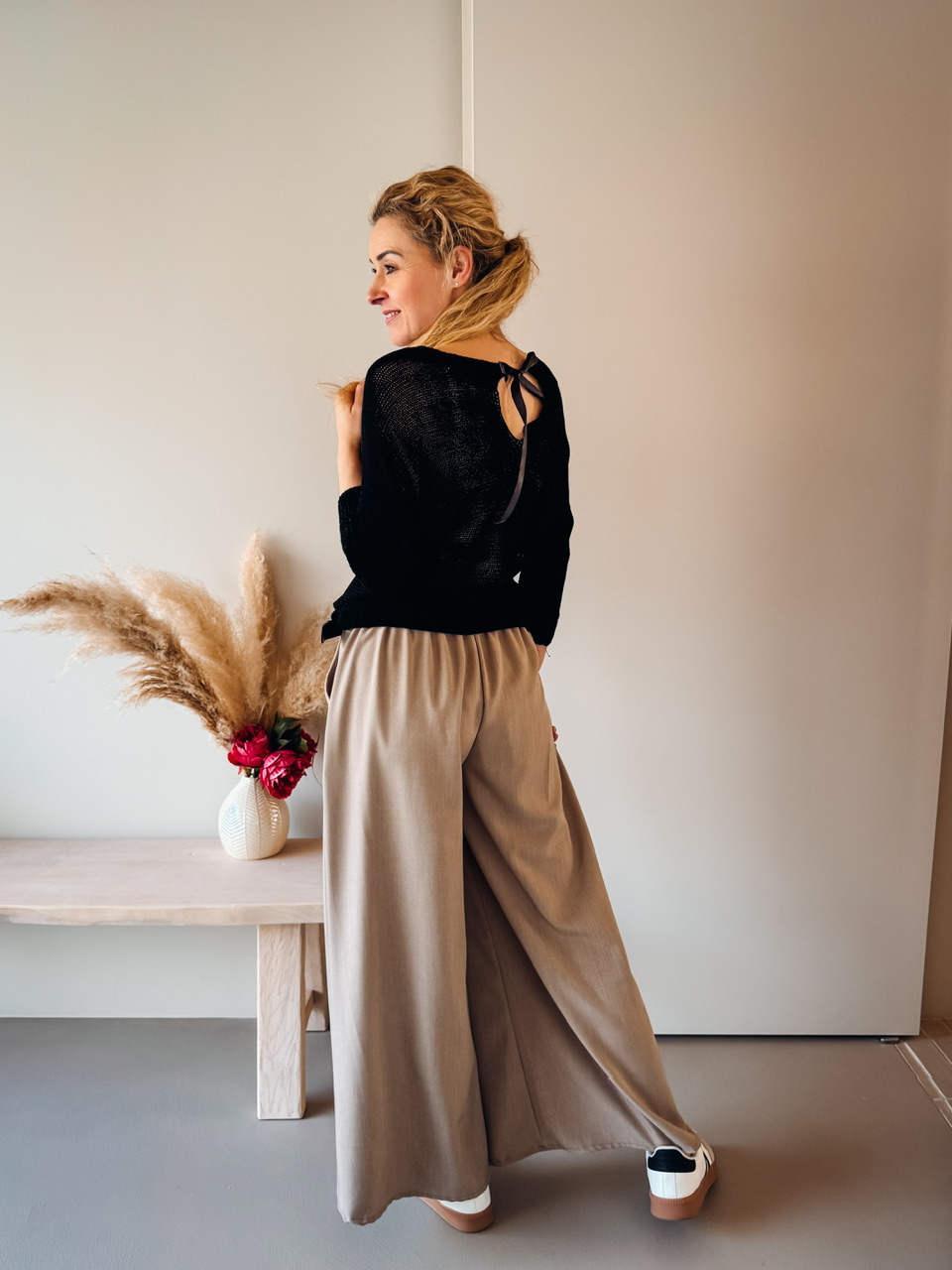 Lahkotna pletenina s 3/4 rokavi on pentljico na hrbtnem vratnem delu.