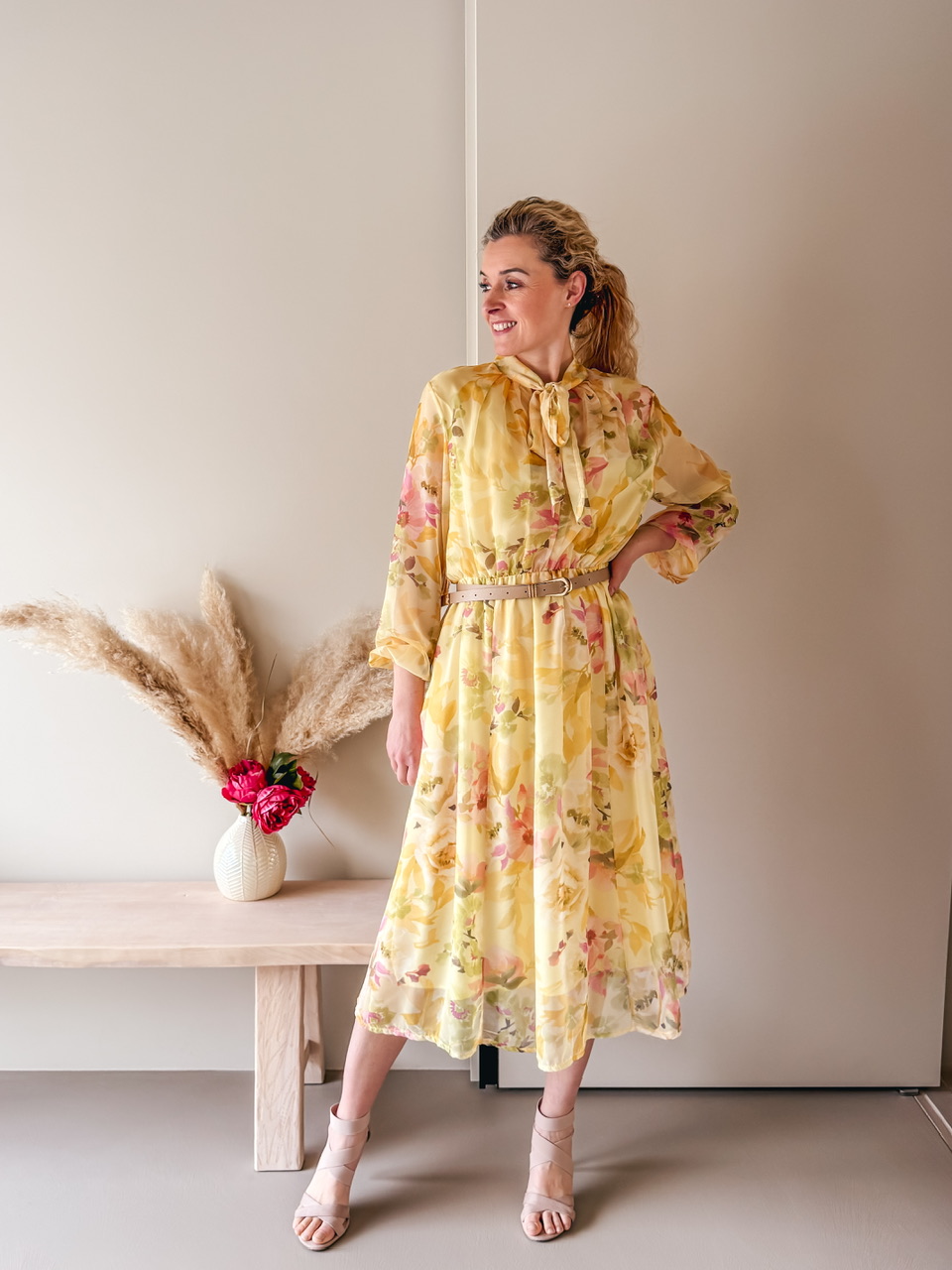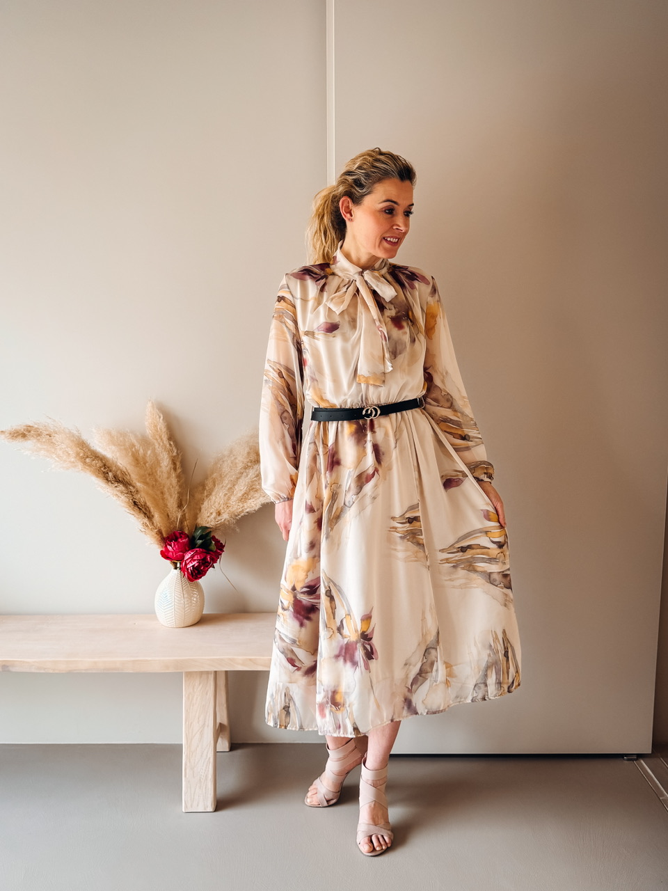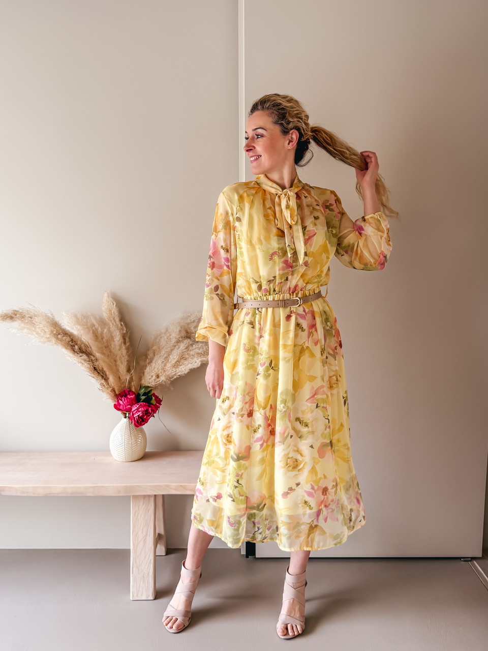 Elegantna obleka s pentljico in elastiko v pasu, zraven je pašček. Univerzalna velikost (36-40).