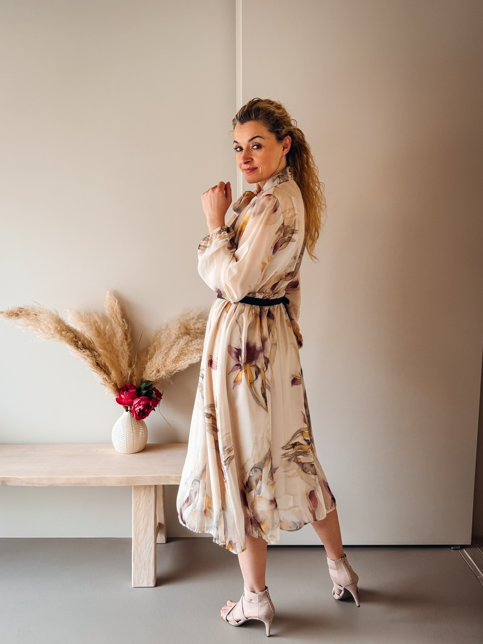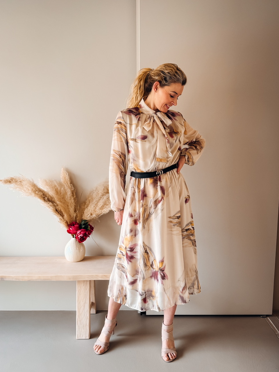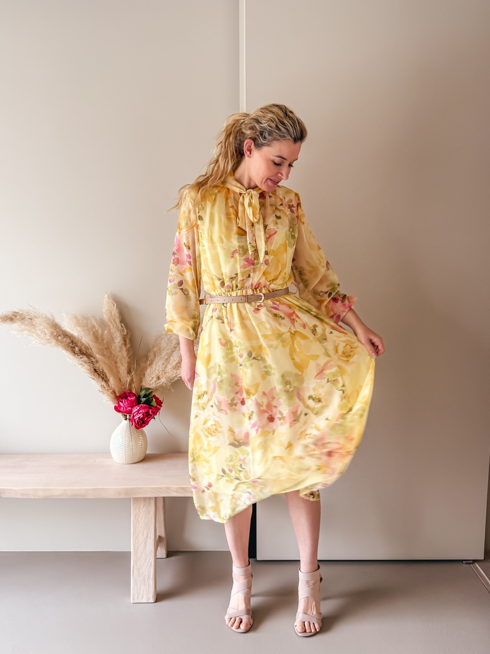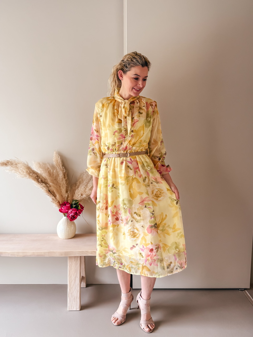 Elegantna obleka s pentljico in elastiko v pasu, zraven je pašček. Univerzalna velikost (36-40).