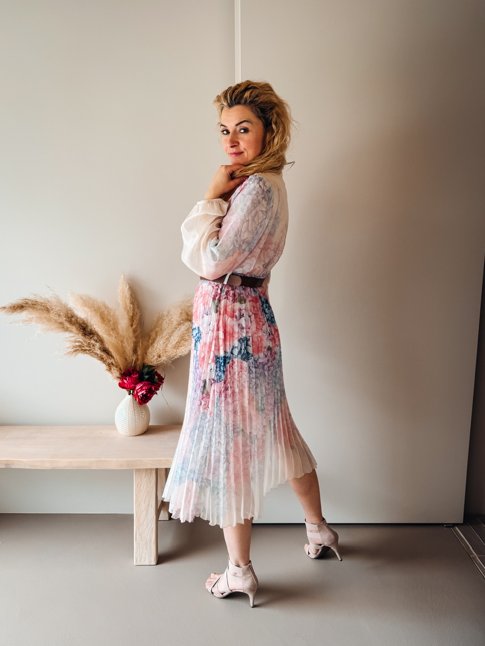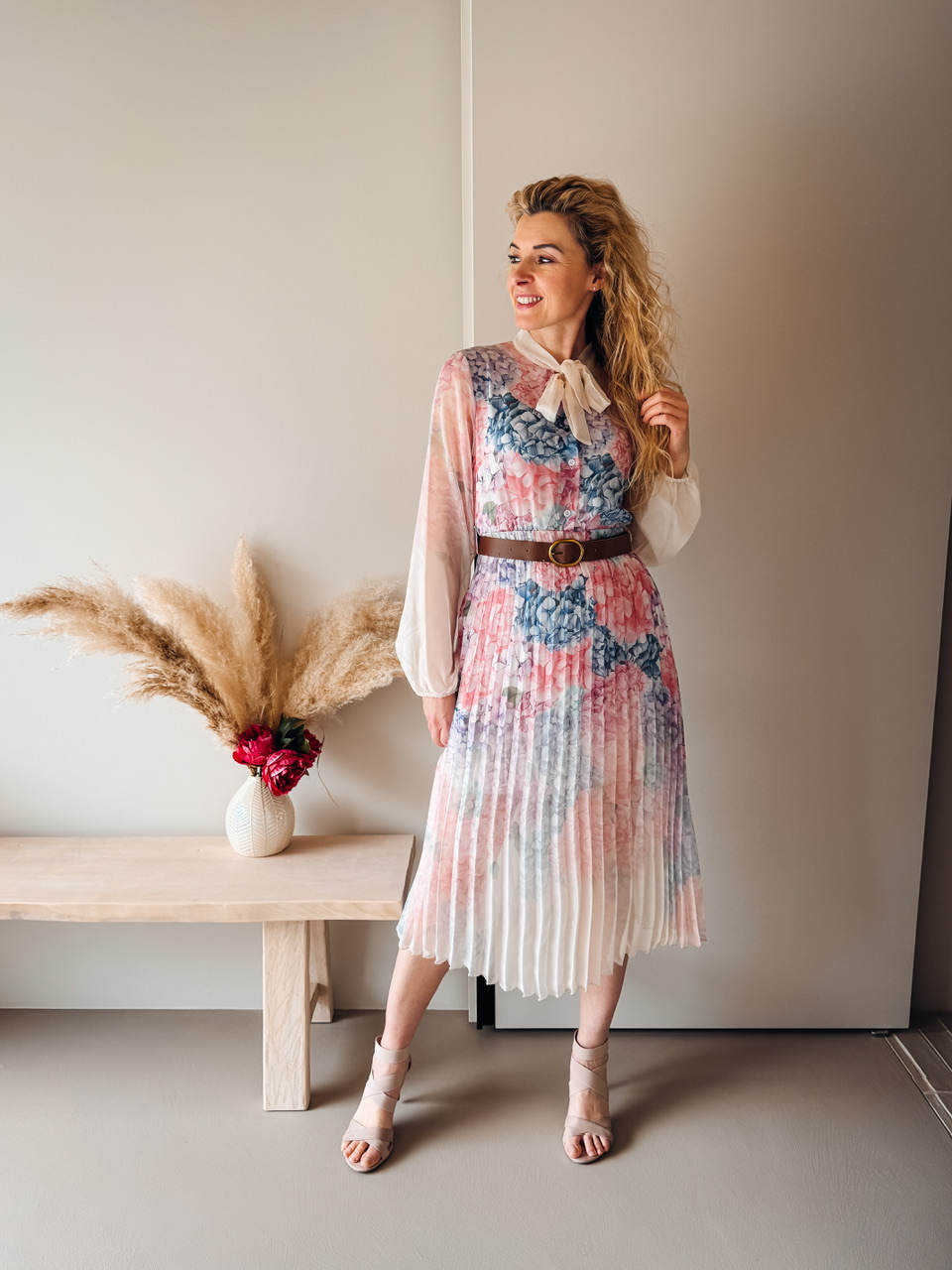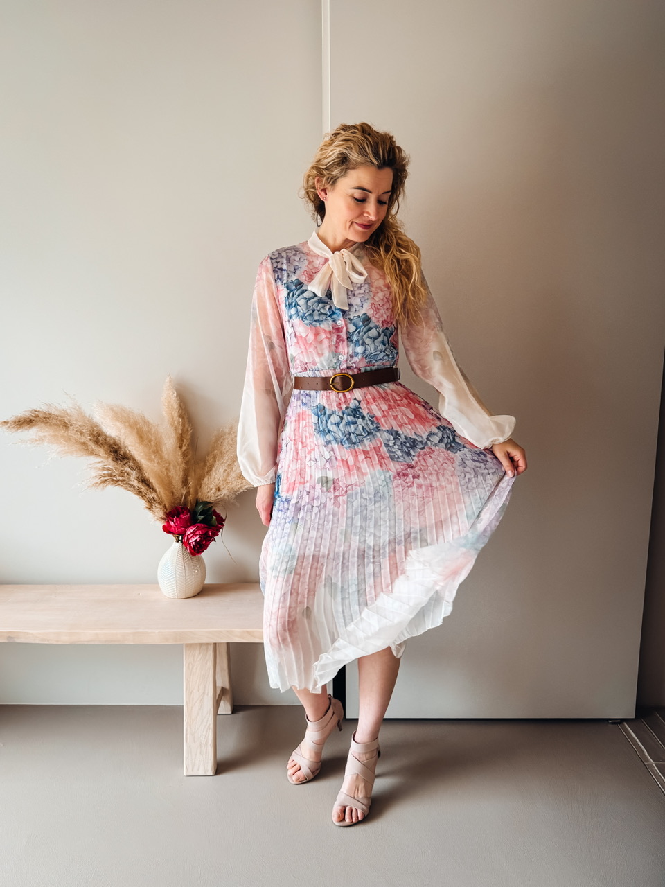 Elegantna obleka z elastiko v pasu in pasom. Se zaveže pentlja okoli vratu.