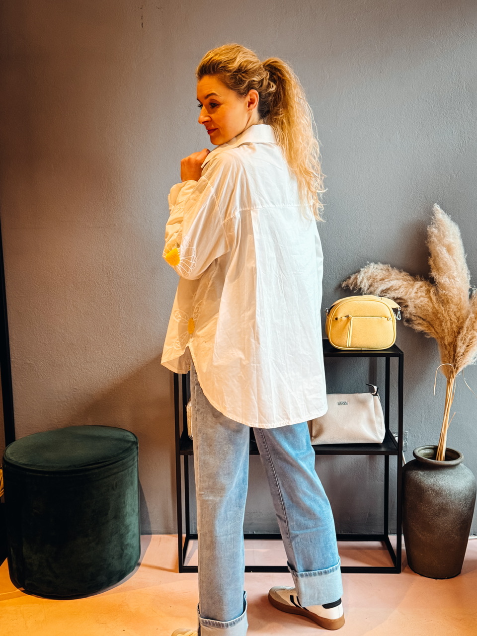 Bombažna oversized srajca z vezenino, zadaj daljša. Obseg prsi je 132cm.
