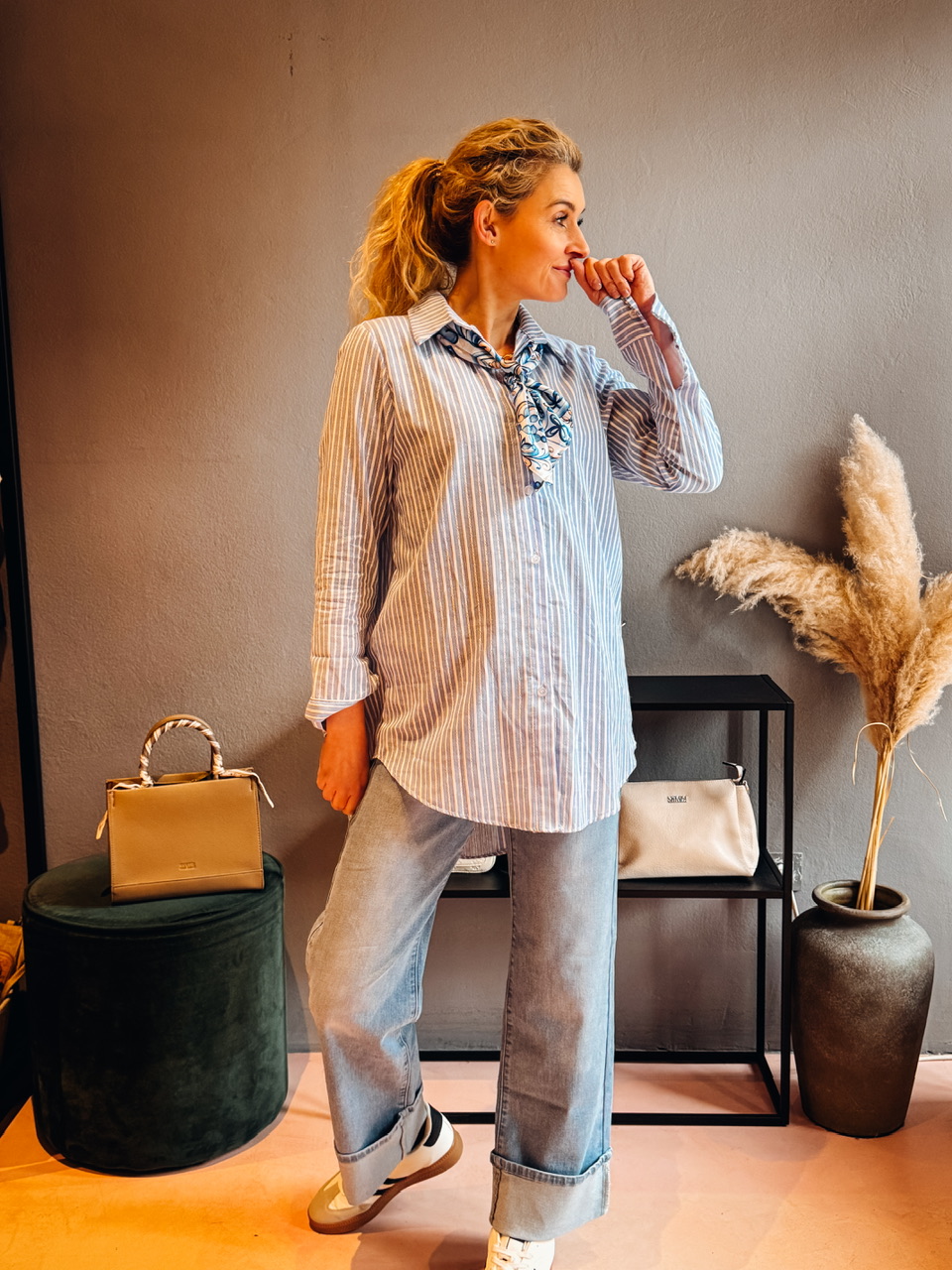 Bombažna srajca z gumbi, uni velikosti (36-40). Lahko jo nosiš odprto ali zaprto. Dodatno jo lahko popestriš z rutko (ni zraven s srajco).