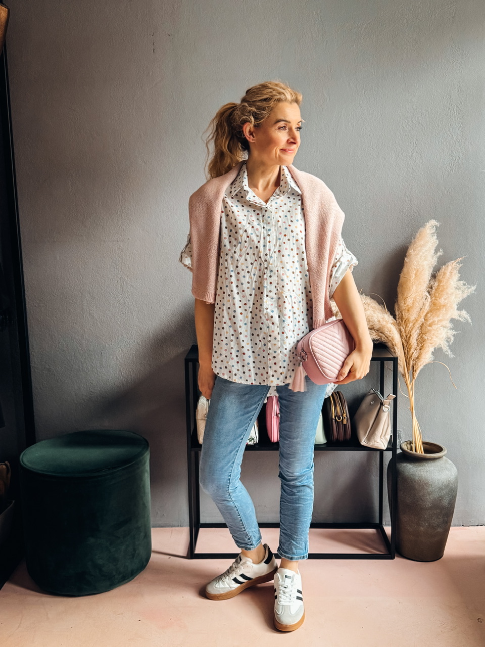 Pikčasta bombažna srajca s 3/4 rokavi z obsegom 124cm.