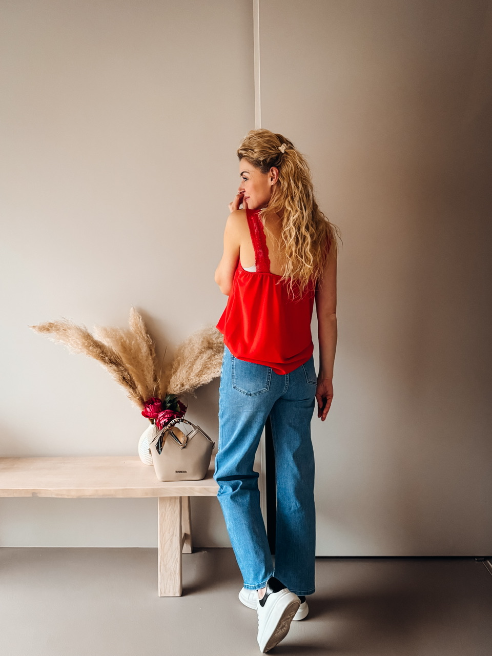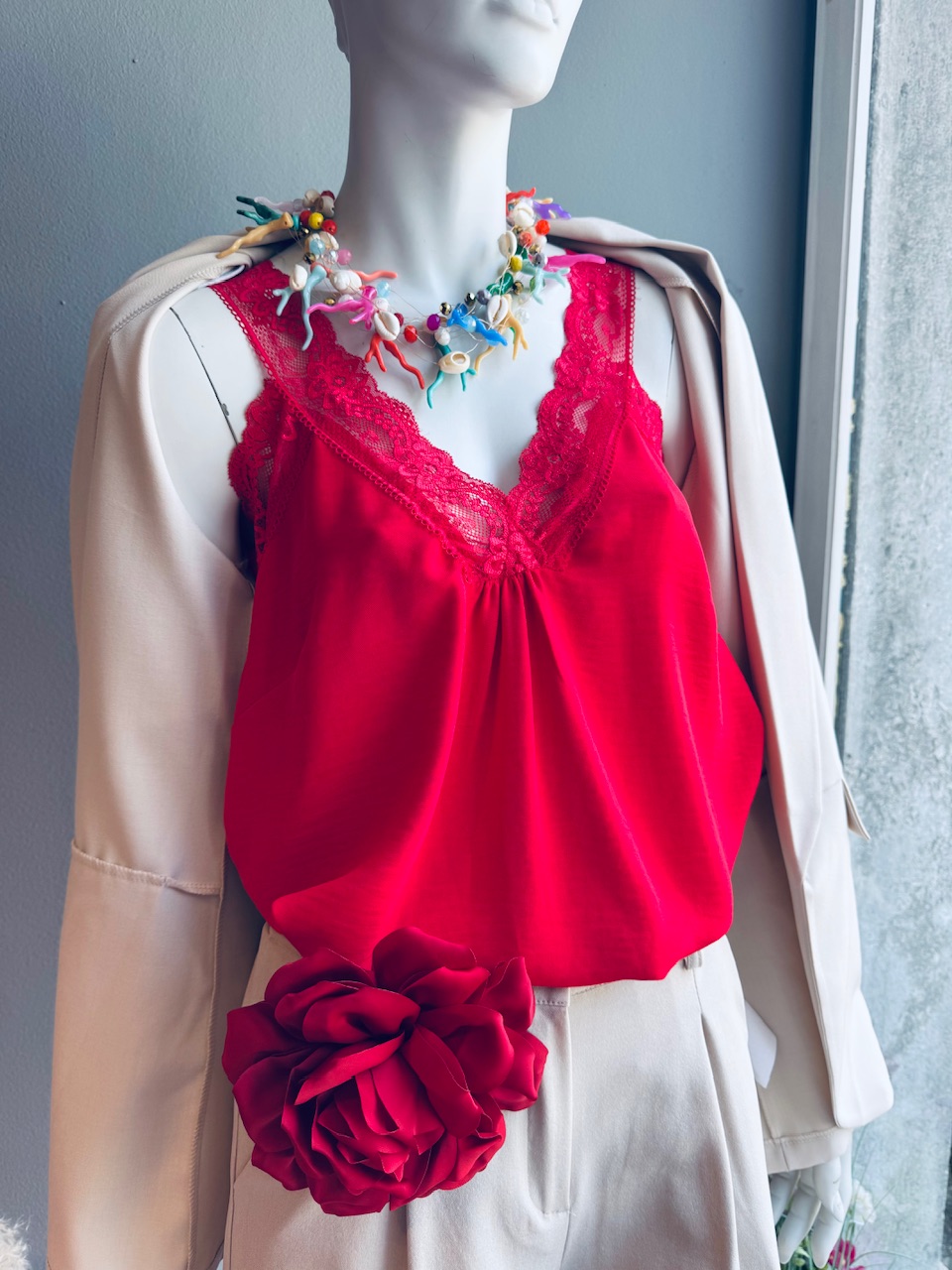 Lep rdeč top z naramnicami in čipko, univerzalna velikost (36-40+). Obseg prsi je 102cm.