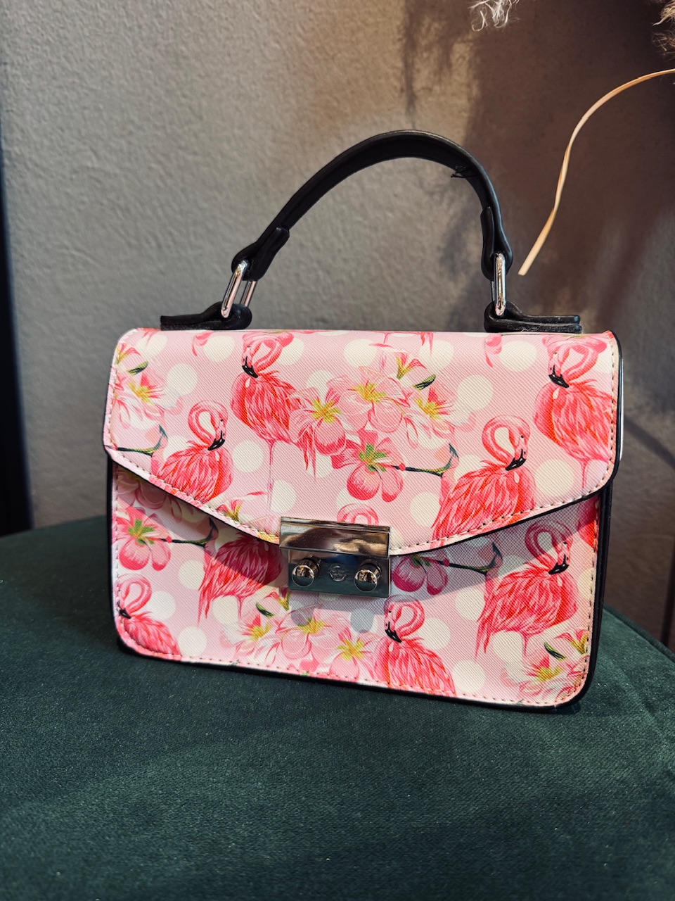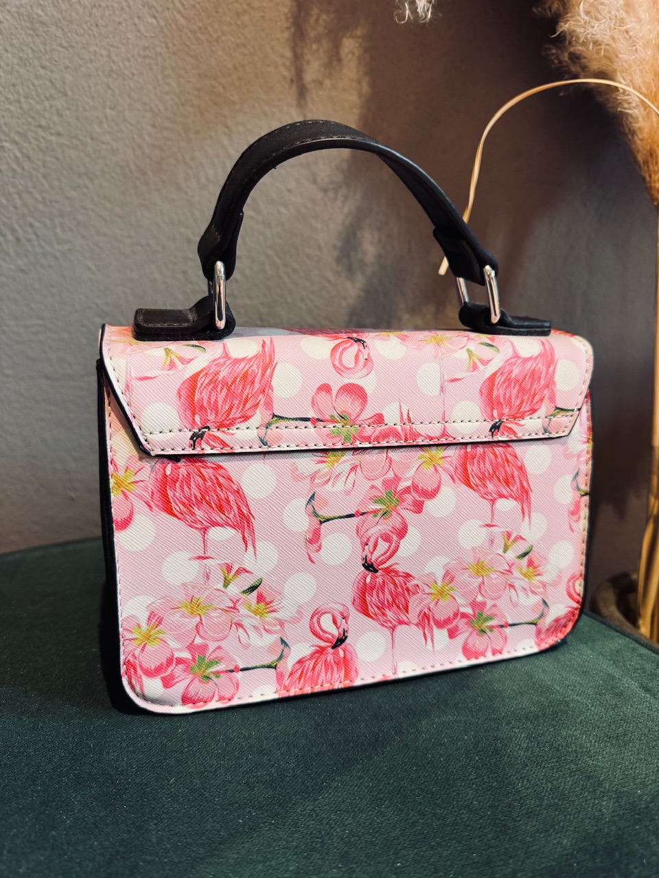 Modna majhna torbica s potiski flamingov, ima podaljšano naramnico in prostor za nujne stvari.