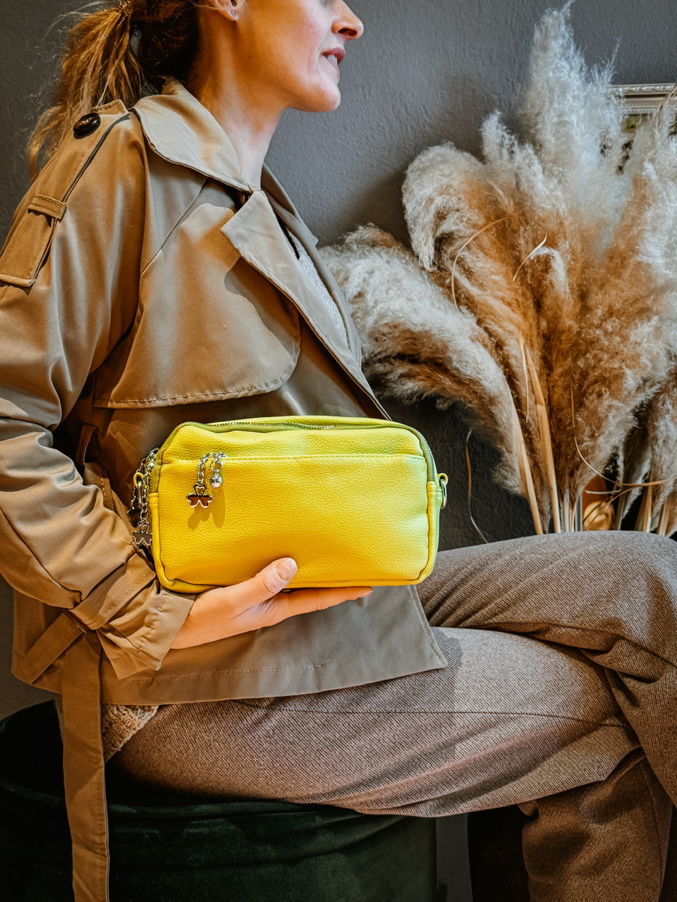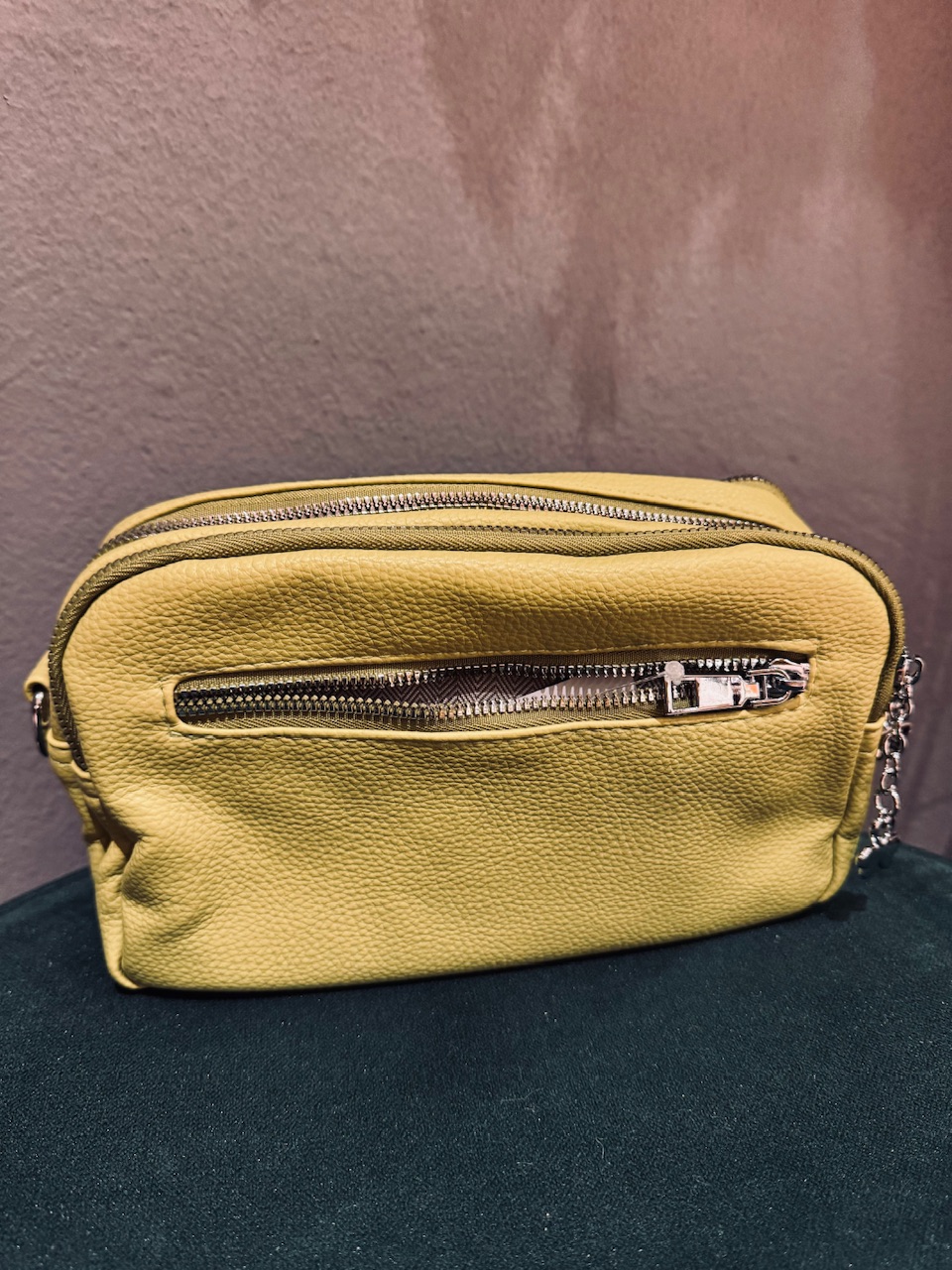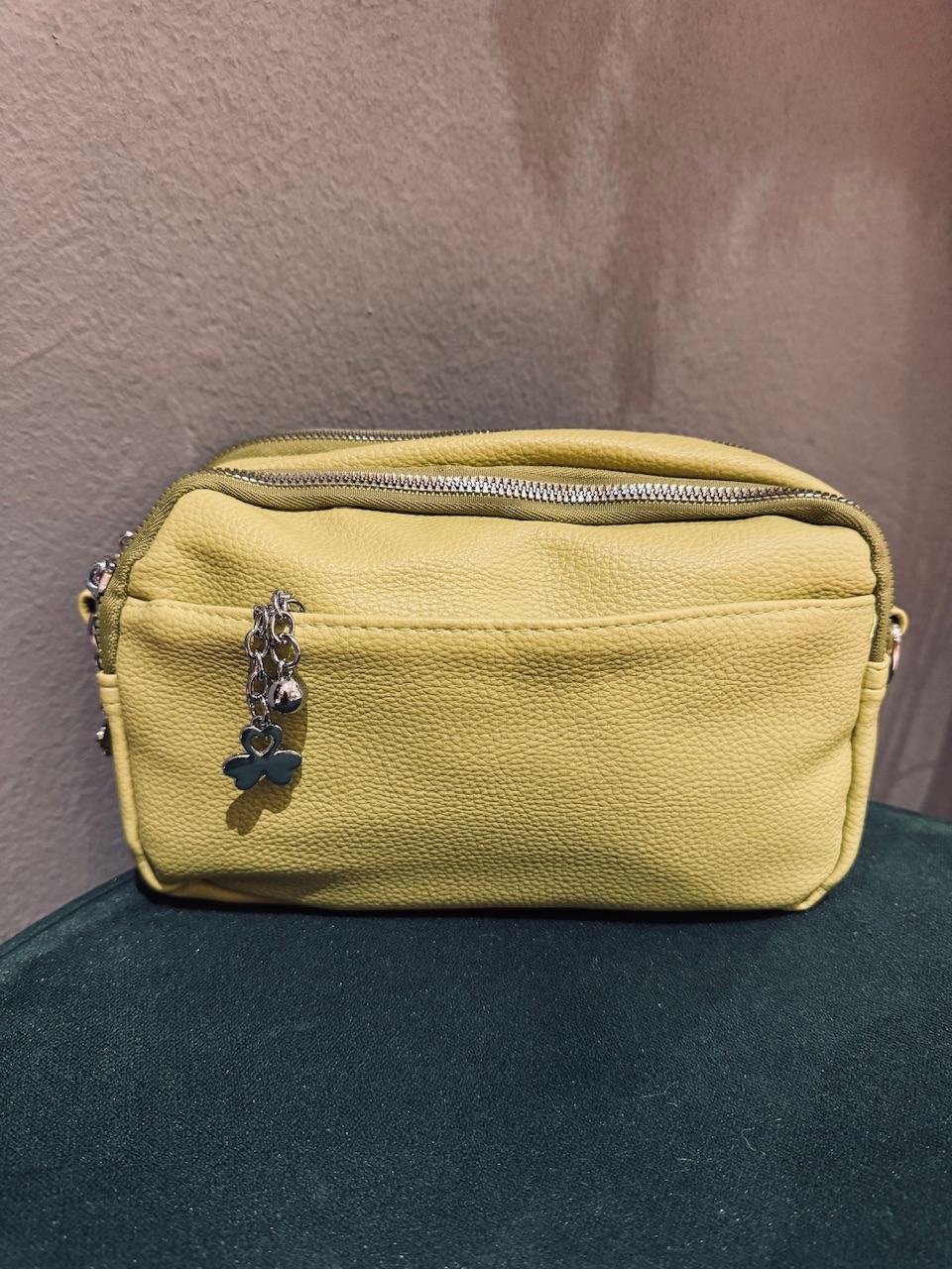Mehka manjša torbica z ločenimi shranjevalnimi prostori in podaljšano nastavljivo naramnico.